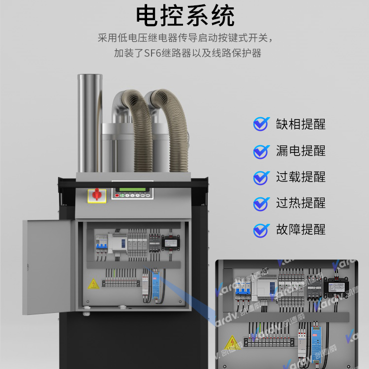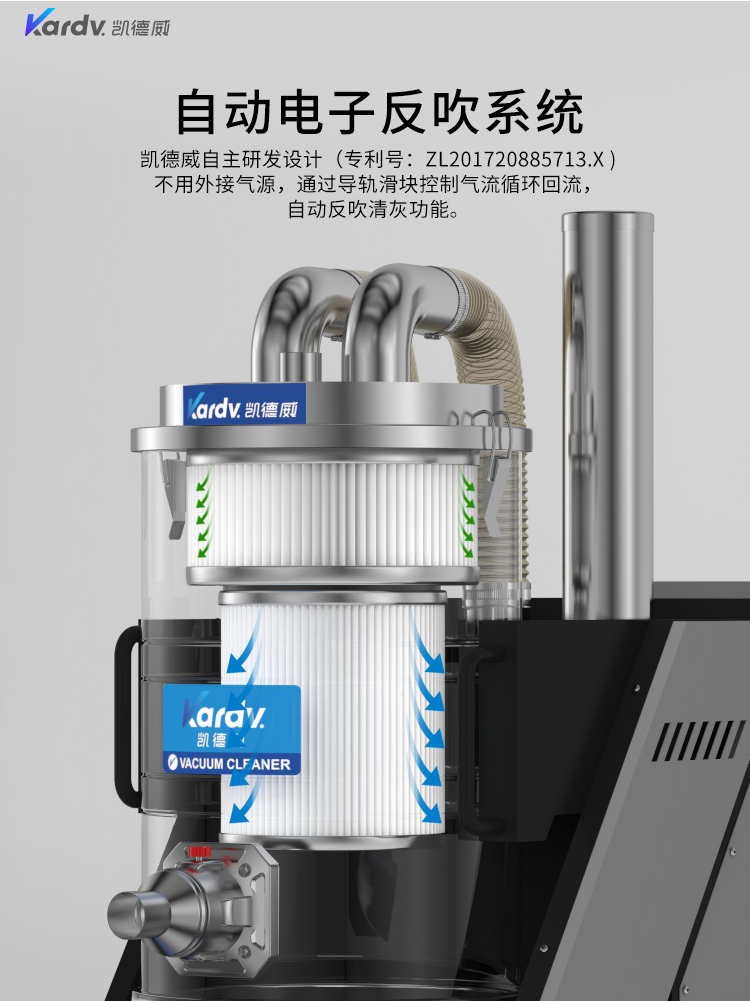 SK - F系列是我司自主研發的智能型工業吸塵器。具有以下六大亮點: A.整機采用工業設計風格,外形剛勁有力,做工精良美觀。 B.集塵桶固定把手設計。C.采用直徑160mm的TPE靜音前后大輪 D.電控系統采用凱德威自主設計帶有液晶顯示屏的智能PLC電控控制系統 E.動力源采用凱德威FY系列定制主機,并選用NSK耐高溫防塵軸承。 F.全自動電子反吹清灰系統具有人工免保養,吸力強勁、穩定,故障率低。 G.集塵系統采用100L不銹鋼材質的上下分離桶,桶壁光滑易清理。