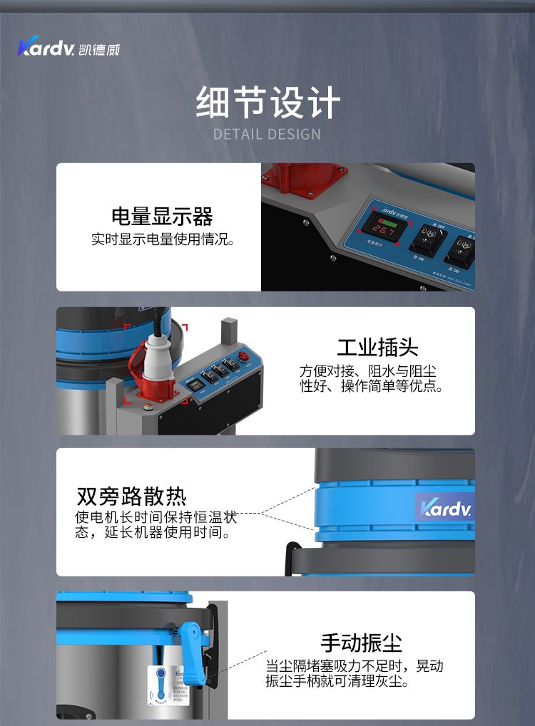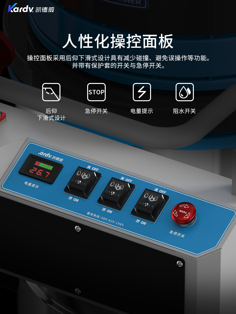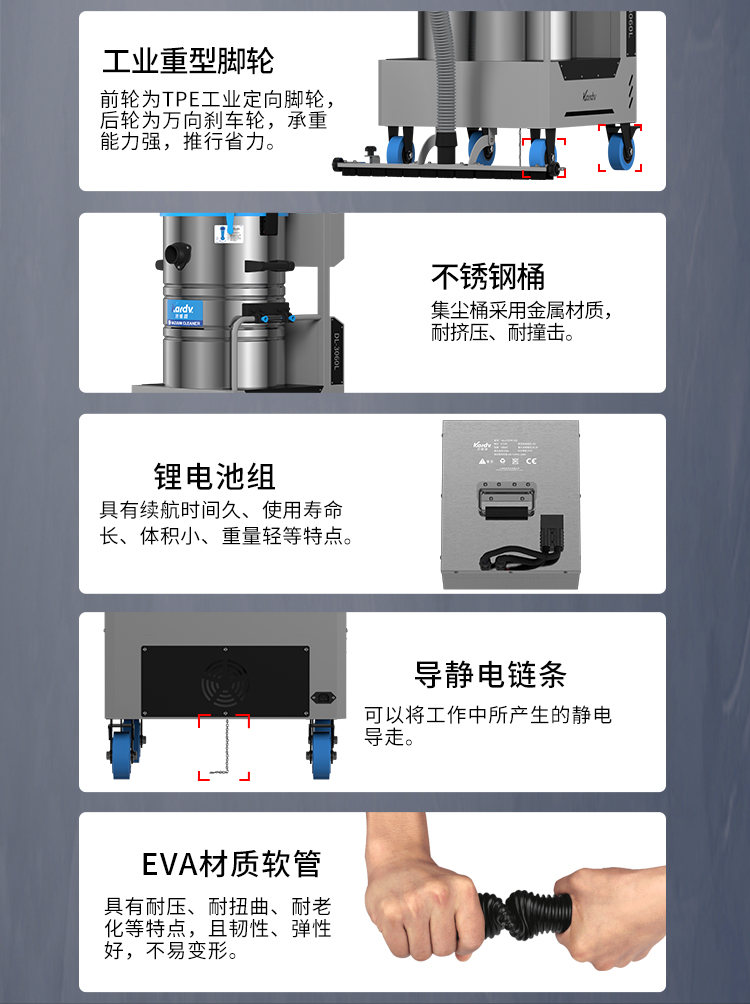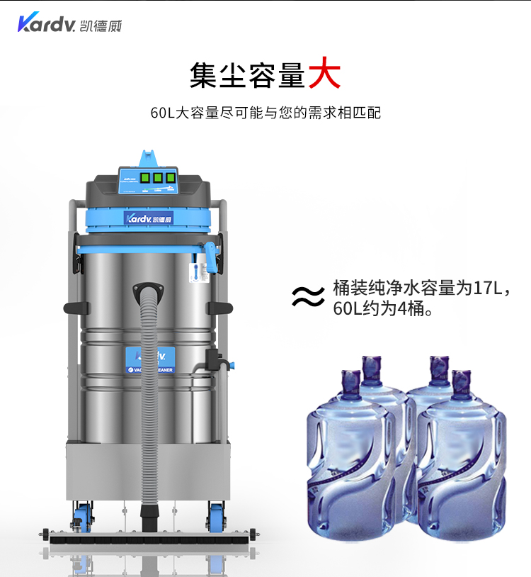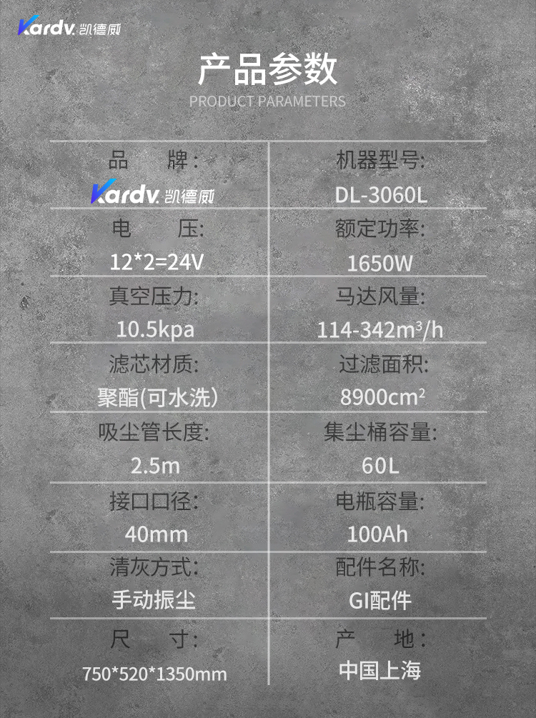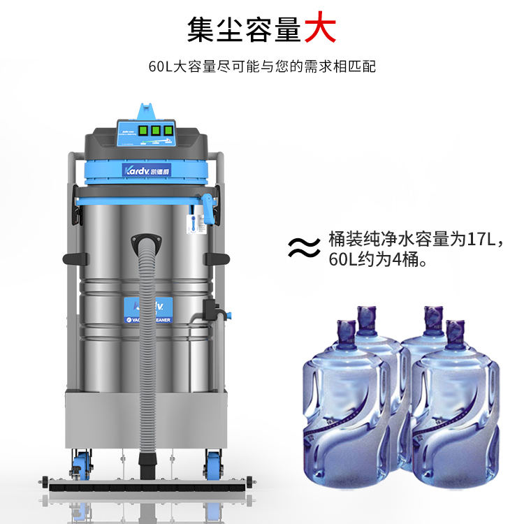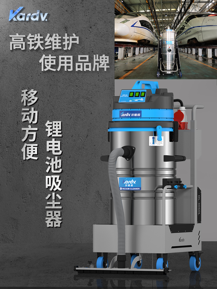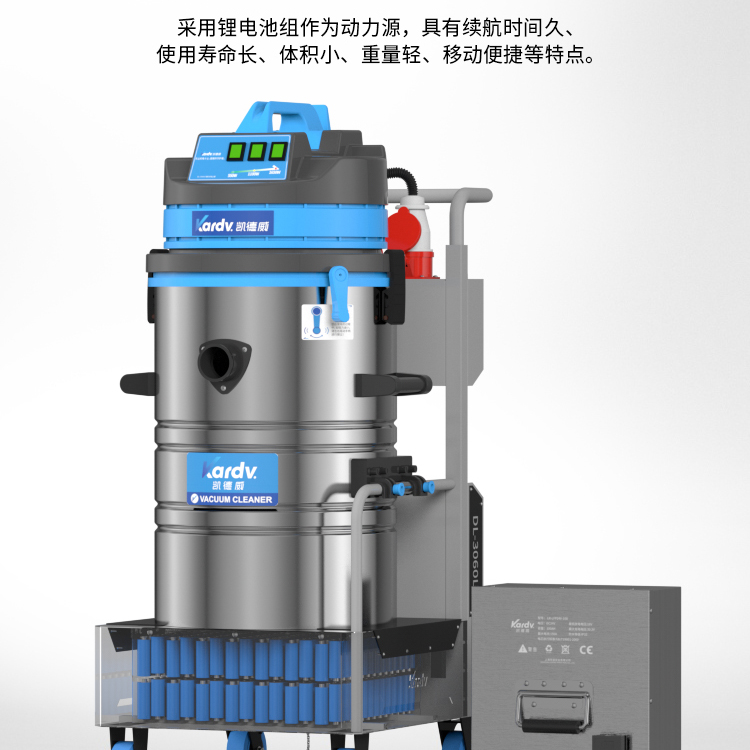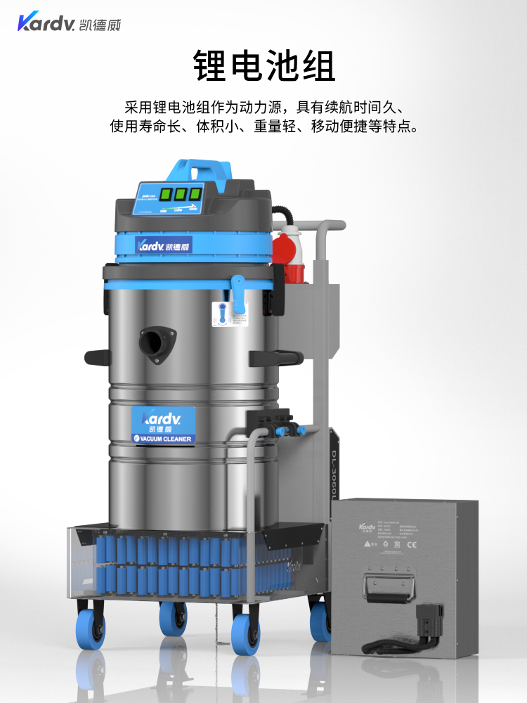 DL-3060L凱德威鋰電池吸塵器是我司的一款充電式工業吸塵器,摒棄了常規拖線式吸塵器使用范圍的局限性。此款吸塵器利用鋰電池組做為電力源,不需外接電源,操作簡單方便。體積小,重量輕,移動便捷,續航時間久,隨充隨用,簡單方便。機器除常規手持式吸塵外,裝置有60cm寬可推吸扒頭,可以邊推邊吸。