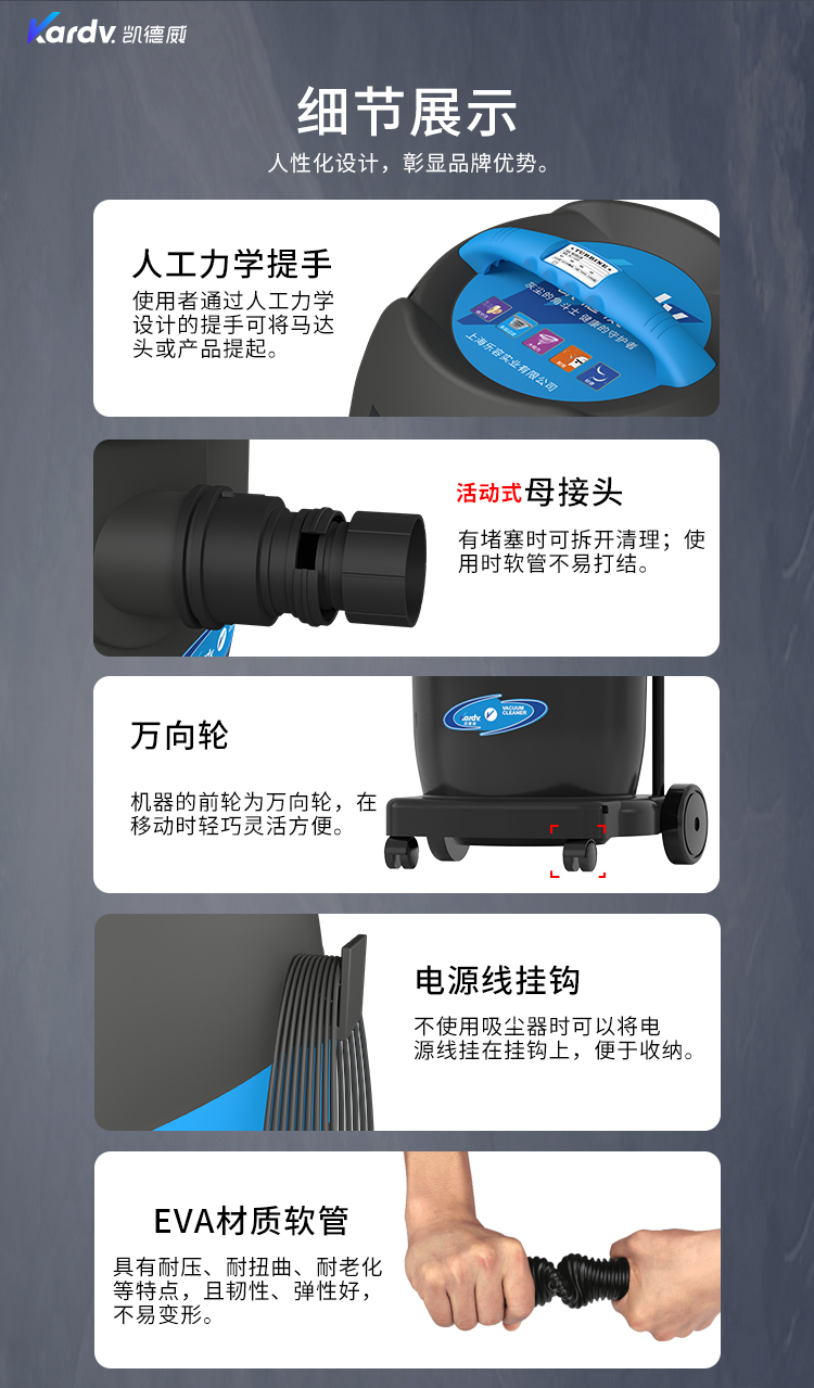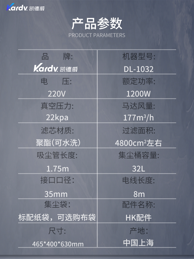 DL-1032是一款干濕兩用型吸塵器,集塵桶為32L;散熱上采用上下氣道分離設計;配有置物架,可以防止工具和配件,方便使用;可以用在倉庫、廠房等;也可與其它產品配套使用,也可用作將廢料收集;也可使用在普通的商業、企業環境,比如一般的辦公室、客房等。