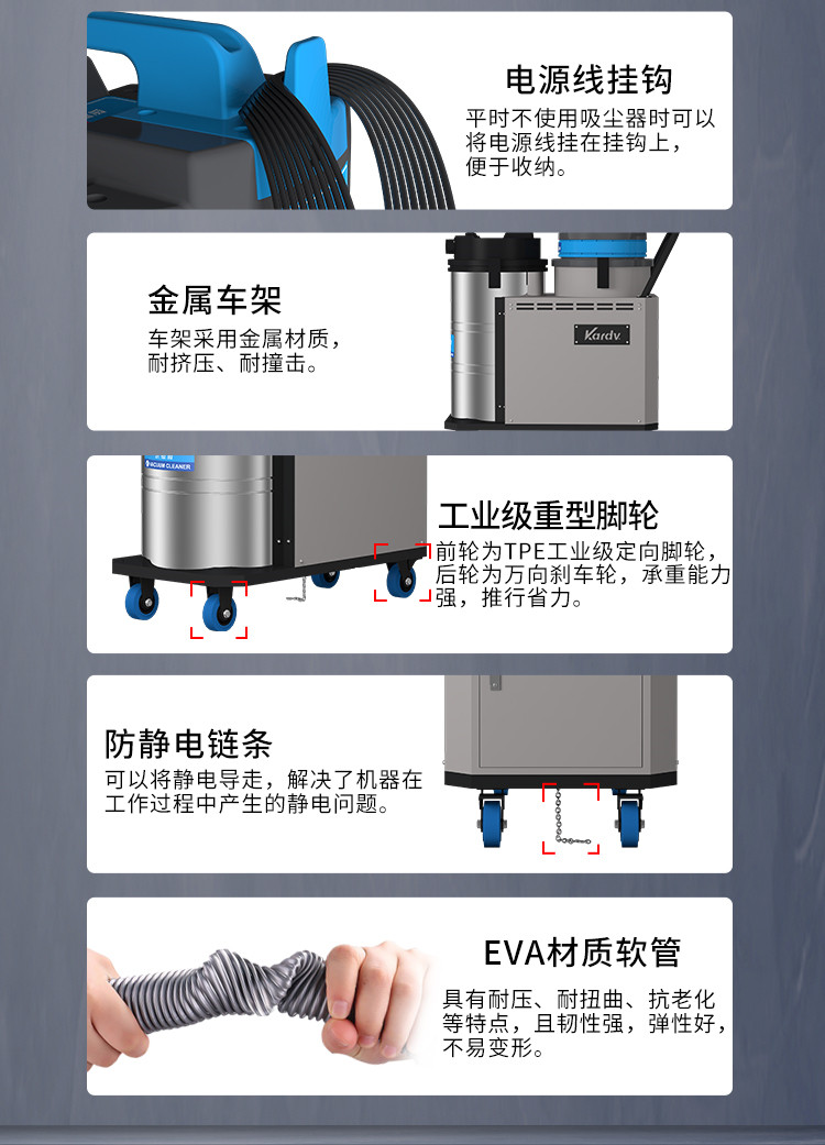 DL-3078X由我司設計,區別常規吸塵器的進氣方式,采用下進氣原理,在吸細小粉塵、紡織廠棉絮、棉絲等容易堵塞過濾器的垃圾時,使大部分垃圾直接進入布袋過濾,少量物質再經過濾器二次過濾,這樣解決了過濾器易堵塞的問題。